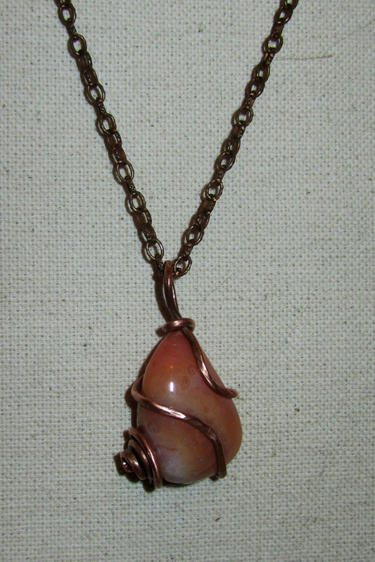 Небольшой кулончик из натурального нежно-оранжевого камня (предположительно сердолик или опал) в обрамлении кованой меди.