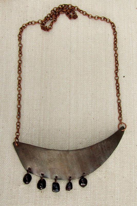Колье-подвеска из медной пластины, оксидированной, с сатиновой текстурой, и бусин натурального граната.