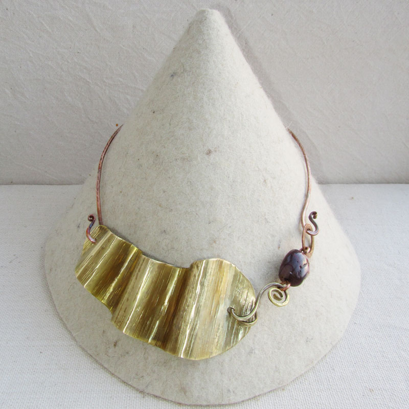 Крупное, но довольно легкое колье выполнено из листовой латуни, отчеканенной и изогнутой волнами.