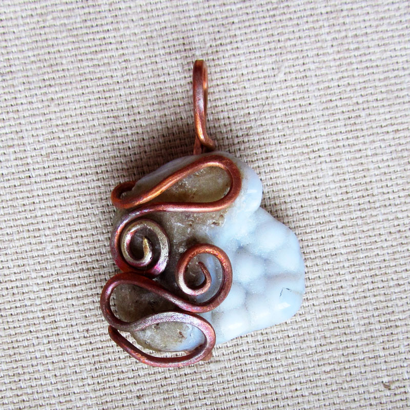 Кулон из сапфирина (голубого халцедона) в медном обрамлении.