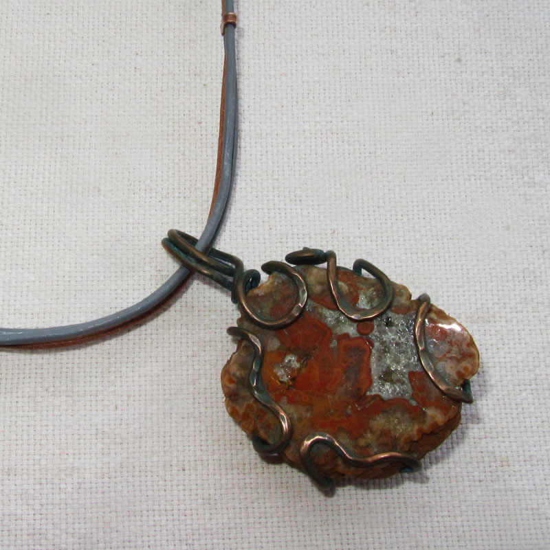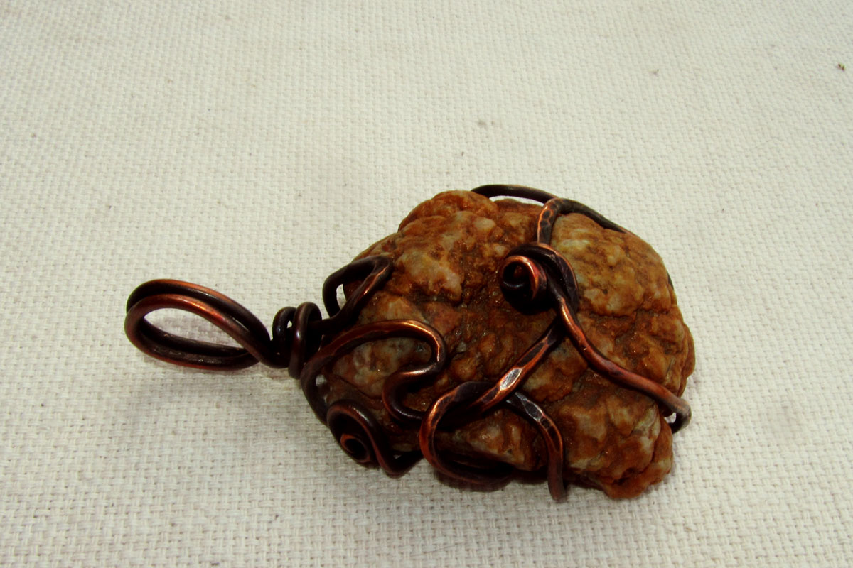 Кованая, патинированная медь прочно удерживает камень и добавляет еще большей выразительности его природной красоте.